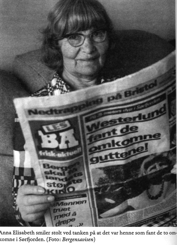 Dermed klatret de to lensmannsbetjente ned den bratte ura, og de kom tilbake med en handfull reklame-fyrstikkesker fra Voss Brukthandel. Den ene av de savnede var eier av denne forretningen. Etter mye strev fikk vi tilkalt dykkere. Før de gikk ned, sa Anna Elisabeth til dem: «Jeg får en slags kjøkkenfølelse av det der nede. Se om det står et hvitt kjøleskap eller en hvit komfyr nær bilen.»