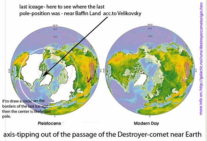 Destroyer breaks into the earth orbit, disturbs it- Earth - in its own rotation, and in its orbit around the sun, causing tremendous Earth quakes, volcanic outbreaks and volcanic outbreaks, floods and elementary storms, wherein the biblical deluge fellows from the occurrence (this doesnt concern the deluge of noahs ark) The Earths own rotation is changed and a pole shift occurs. |