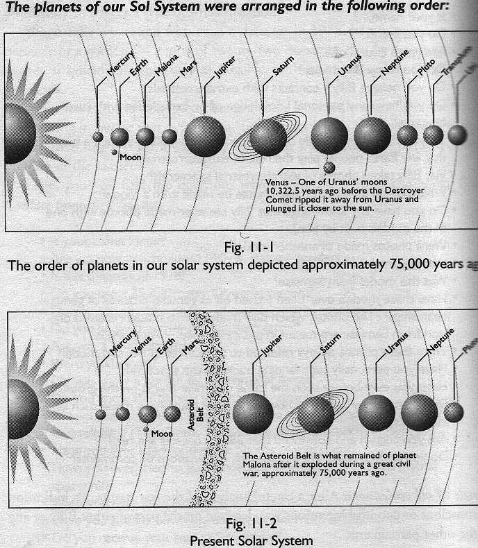 Meier: yes, indeed, i must have overseen this, will take notes. -So,1511 BC to 733 BC, a very bright and wandering planet, 1,4times size of Earth's moon breaks into the solsystem. Coming from an unknown origin, it bursts out from outer space and breaks into Venus' orbit, in order to disturb its course. Afterwards, it passes very closely by the Earth and disturbs its orbit and balance, wherewith the Earth , during the next 158years, is disturbed several times by the accompanied returning wanderer, and even is turned around in its rotation. All of this is accompanied by apocalyptic catastrophes, wherewith the points of the compass and the Earth's yearly cycle around the sun is changed, so the orbit time slowed down to 284days. Worldwide conflagrations, earthquakes, deluges and volcano eruptions were the consequences and left their traces on Earth. Fragments of continents and islands sank onto the seas, while new land fragments rose up. Well, this time I also have this data. I may have been quite innovative when I copied off your recordings and overlooked this information.