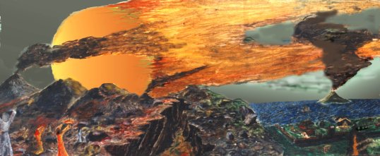 Destroyer comes dangerously near to Earth and causes severe catastrophes, Earth quakes, volcanic outbreaks, elementary storms and floods of enormous size are the consequences. Volcanic ash slightly darkens the sun, which lasts for several weeks. The volcano Santorini in the Hellenic Sea, explodes, and causes an 1800 m high floodwall which rolls over the Mediterranean sea, and further into the Nile-land of Egypt and floods everything. Not only many human beings die, but also countless animals, causing much illness, due to their decomposing caresses, after the rolling back of the flood. Thru these occurances, the 7 biblical plagues are caused in the moses-time, therein the water of the nile is colored red by the blood of the uncountable dead life forms, with their bodies torn open, and mal-treated. The flood rolls back again, and thrusts back over the Mediterranean sea, right up to the Northeast, where it then floods the land of syria, causing enormous terror and devastation. |