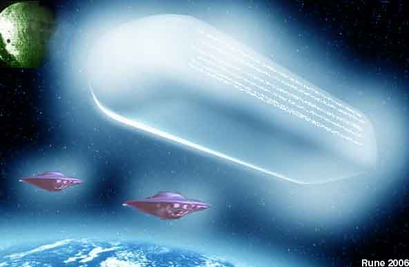 Vi kan også reise uten skip, men ikke over lange avstander eller lange tidsperioder. Mange som ser romskip på nært hold, kan fortelle at skipet var meget sterkt lysende. Det er vårt høye frekvensnivå som forårsaker det. Lyset blir også sterkt fordi det oppstår friksjon mellom skipet og molekylene i luften, som har et lavt svingningsnivå. Vi vil også nevne de såkalte "lysskipene", som også blir sett av menneskene på jorden. Disse er uavhengig av form, og beveger seg fritt med utrolige hastigheter. Disse skipene er "skapt" av individer på planeter som har kommet så langt i sin utvikling at de er steget ut av materien. De er ikke lenger fysiske (fra mentalplanet altså - utg.anm.). De bruker energiene som er allestedsnærværende i rommet. De bruker denne energi til fritt å skape hva de trenger, både ved reiser ut i rommet, og til å skape alt de trenger på sine egne planeter.