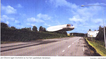 - Jag var mycket nära att ringa larm-numret på min mobil men jag lyckades hejda mig, jag ville inte bli beskylld för falskt alarm. Flygplan på väg in mot Ängelholms flygplats hade han sett många gånger förut och det var inte ovanligt för honom att se dem på låg höjd över Örkelljunga. Det som verkligen stod ut denna gång var hur lågt detta "flygplan" befann sig på himlen. - Det kom så långt ner, bara tio till femton meter över vägbanan, berättar han.