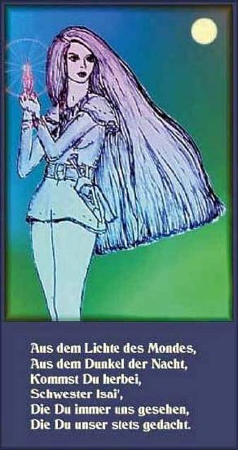 ISAIS war ziemlich groß und sehr schlank. Sie trug ein langes, hellblaues Kleid. Ihre Haare waren blond und zu einem enorm dicken Zopf geflochten, der vor ihrer linken Schulter hing, fast bis zum Schoß. In der Hand hielt Isais einen schmalen goldenen Stab, aber den konnte ich nicht genau erkennen. Alles war sehr hell um sie. Welche Farbe ihre Augen haben, weiß ich nicht, ich glaube, ein beinahe gelbliches Braun, vielleicht auch grün.