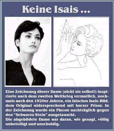 Das nach dem zweiten Weltkrieg neu entstandene falsche Isais-Bild ging übrigens auf ein sehr hübsches Berufs-Fotomodell zurück, welches dafür die optische Vorlage bot, ohne davon zu wissen.