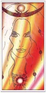 Die Perle auf der Stirn symbolisiert ihr drittes Auge, das in die Menschen hineinschaut. Über ihrem Kopf schwebt die magische Sonne, die Quelle des göttlichen Lichts Ilu. Die langen Haare der Göttin sind ausgebreitet wie magische Schwingen,