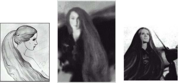 Ferner gibt es eine Zeichnung in Holz (um 1230) mit noch längerem Haar, sowie ein Tonrelief (um 1235), wiederum mit hüftlangen Haaren.