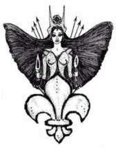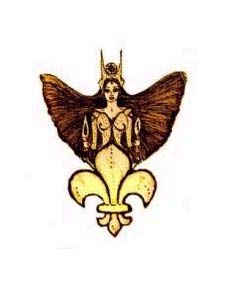 daß sie die Jenseits/  Diesseits-Grenze durchschreiten kann, und in der anderen Hand einen Spiegel, der sie alles erschauernd macht. (Darstellung babylonisch, ca. 1600 v. Chr., z.Zt. Bagdad). Die Form auf der Lilie ist eine Adaptation der Templer-Sektion Augsburg-Wien-Genua (um 1220).