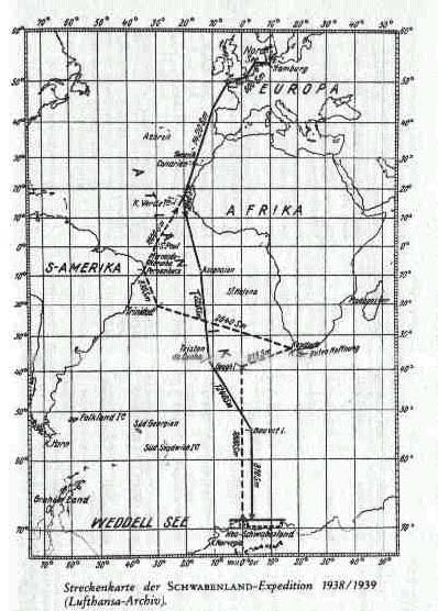 Die „NEUSCHWABENLAND“ verliess Hamburg am 17.12.1938 und erreichte die Antarktis am 19.01.1939 bei 4° 15´ W und 69° 10´S. (s.Karte).